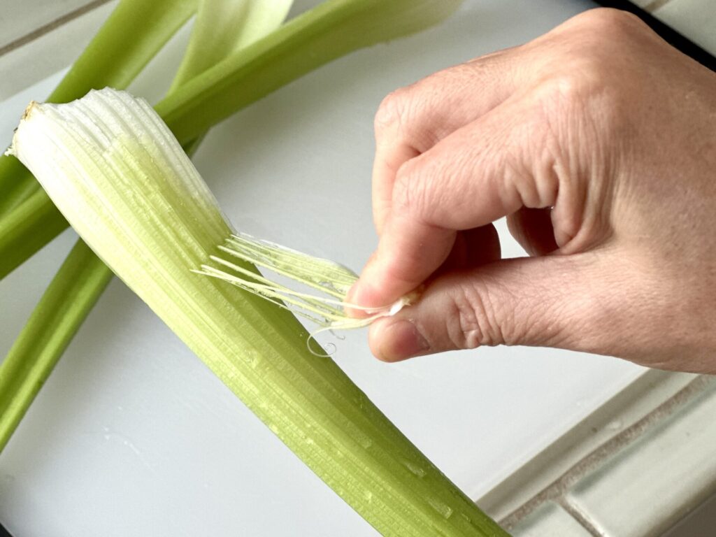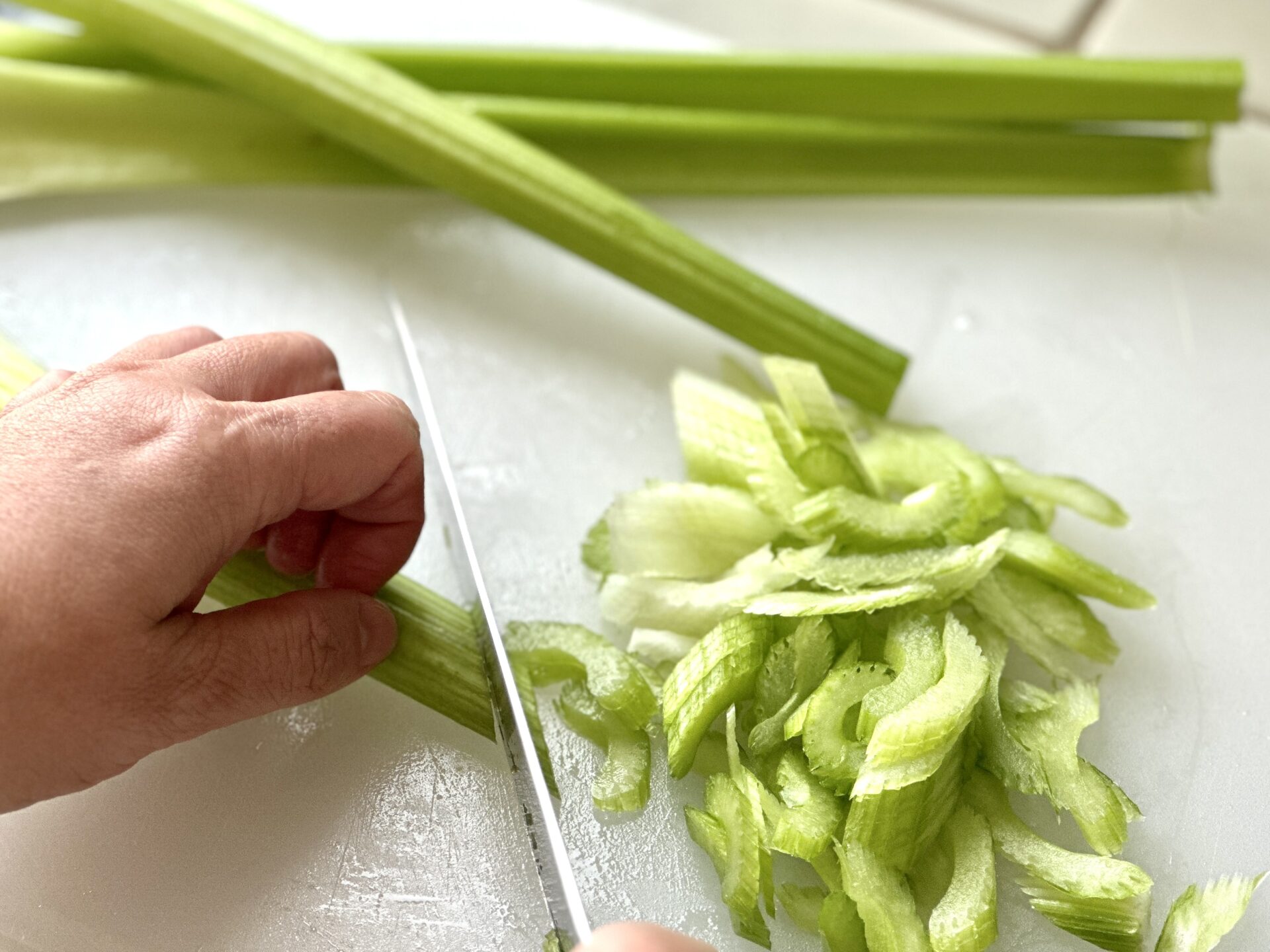 • Remove strings and slice celery as thin as you can, and sprinkle with 1/4 tsp salt. Let it sit for 5 minutes.