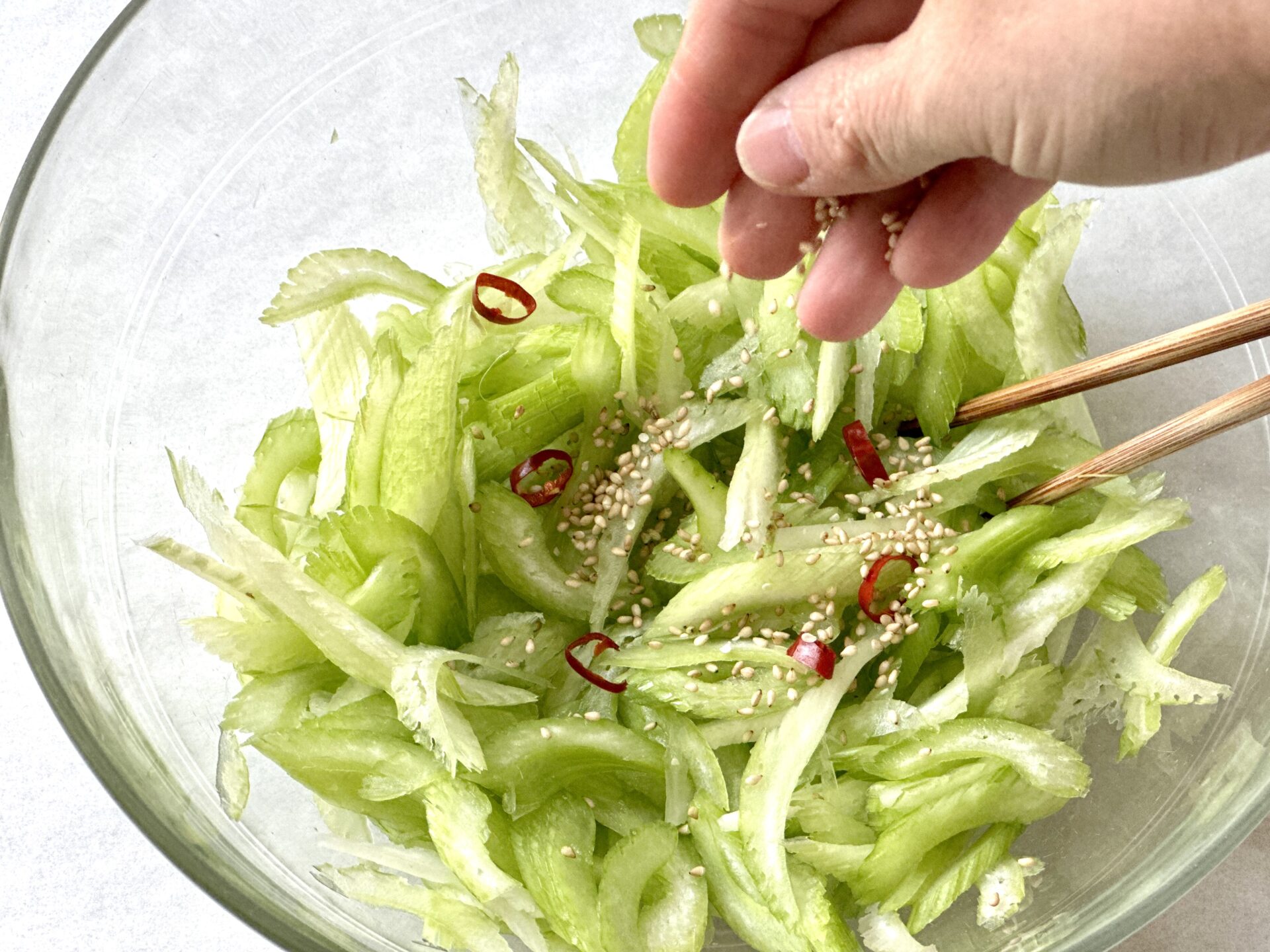 • In a bowl, whisk rice vinegar, sugar, and salt together until the sugar dissolves. Squeeze water out from celery, and add to the vinegar mixture. Then add sesame seeds and chili. Chill for 30 minutes.