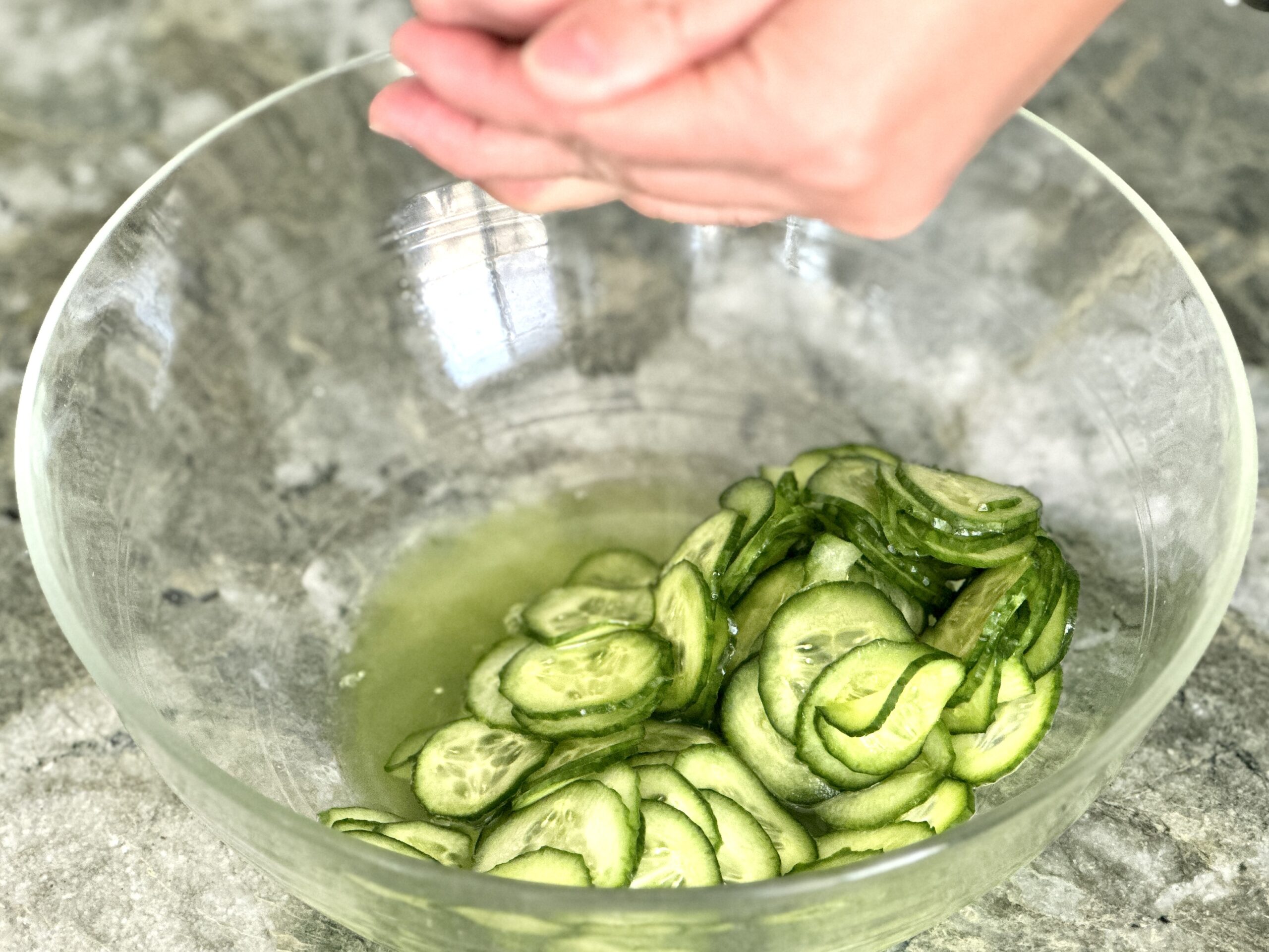 • Slice cucumbers thinly and place them in a bowl. Stir in salt, and let it sit for 5 minutes. Squeeze water out from cucumbers.